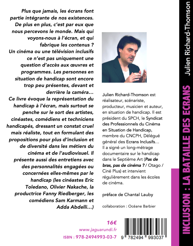 Julien Richard-Thomson est connu pour son engagement en faveur de l’insertion professionnelle des artistes et techniciens en situations de handicap dans les métiers du cinéma et de l’audiovisuel, il préside notamment le premier Syndicat des professionnels du cinéma en situations de handicap (SPCH) et dirige Les Ecrans Inclusifs. Multipliant les interventions de sensibilisation dans les écoles de cinéma (ESRA, EICAR…) et les travaux avec le Centre National du Cinéma, il est aussi le créateur de La Belle Séance (événement en faveur du public handicapé, organisé par APF France Handicap). Pour cela, il a été nommé cette année membre du Conseil National Consultatif de la Personne Handicapée par la ministre chargée du handicap, Charlotte Parmentier-Lecocq. Ce livre lui fournit l’occasion de détailler de nombreuses propositions pour améliorer l’inclusion au sein du Septième Art.